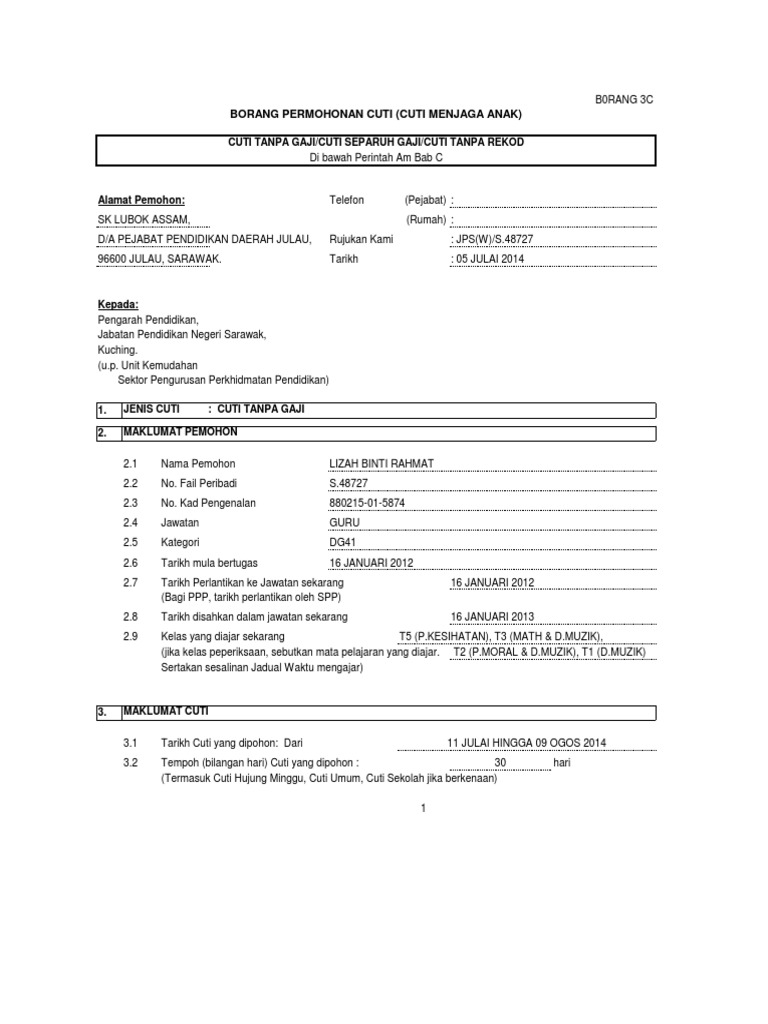 Surat Mohon Cuti Tanpa Rekod from imgv2-1-f.scribdassets.com Borang cuti kematian ahli keluarga terdekat. Borang permohonan cutipermohonan cuti tanpa rekod menduduki peperiksaandi bawah perkara 44 perintah a bab c danpekeliling perkhidmatan bil.9 tahun 1991 (pindaa… Borang cuti tanpa rekod peperiksaan. Surat ijin cuti orang tua/wali kepada yth. Borang cuti rehat contoh surat cuti permohonan cuti borang cuti rehat kerajaan contoh borang pendaftaran borang cuti sakit kakitangan awam sekolah surat memohon cuti sekolah borang cuti tahunan borang keluar pejabat contoh borang aduan pelanggan surat ijin cuti contoh surat. Moshims borang cuti tanpa gaji sebab peribadi kkm to download moshims borang cuti tanpa gaji sebab peribadi kkm just right click and save image as. Jumlah cuti tanpa rekod (ctr). Tawaran permohonan cuti belajar tanpa gaji tanpa biasiswa via www.mykssr.com.