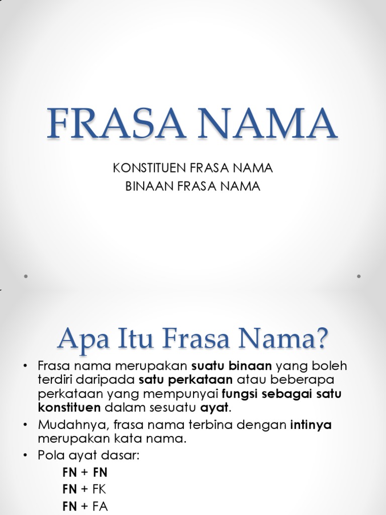 Lalu, bagaimana untuk menanyakan siapa nama seseorang dalam bahasa inggris? Unsur intinya boleh wujud secara bersendirian sebagai satu patah perkataan ataupun diikuti oleh penerang sesudah unsur inti tersebut. Jika ini kurang cocok silahkan pilih hasil yang ada dibawah ini. 6 inti frasa frasa nama (s) frasa kerja (p) pasir (inti) putih (pen) roboh (inti) di tepi kali (pen) frasa nama (s) frasa nama (p) haji (pen) mhd amin (inti) pensyarah (inti) bahasa (pen) frasa nama (s) frasa adjektif (p) gadis (inti) desa itu (pen) cantik (inti) amat (penguat). Apakah frasa nama itu 3.