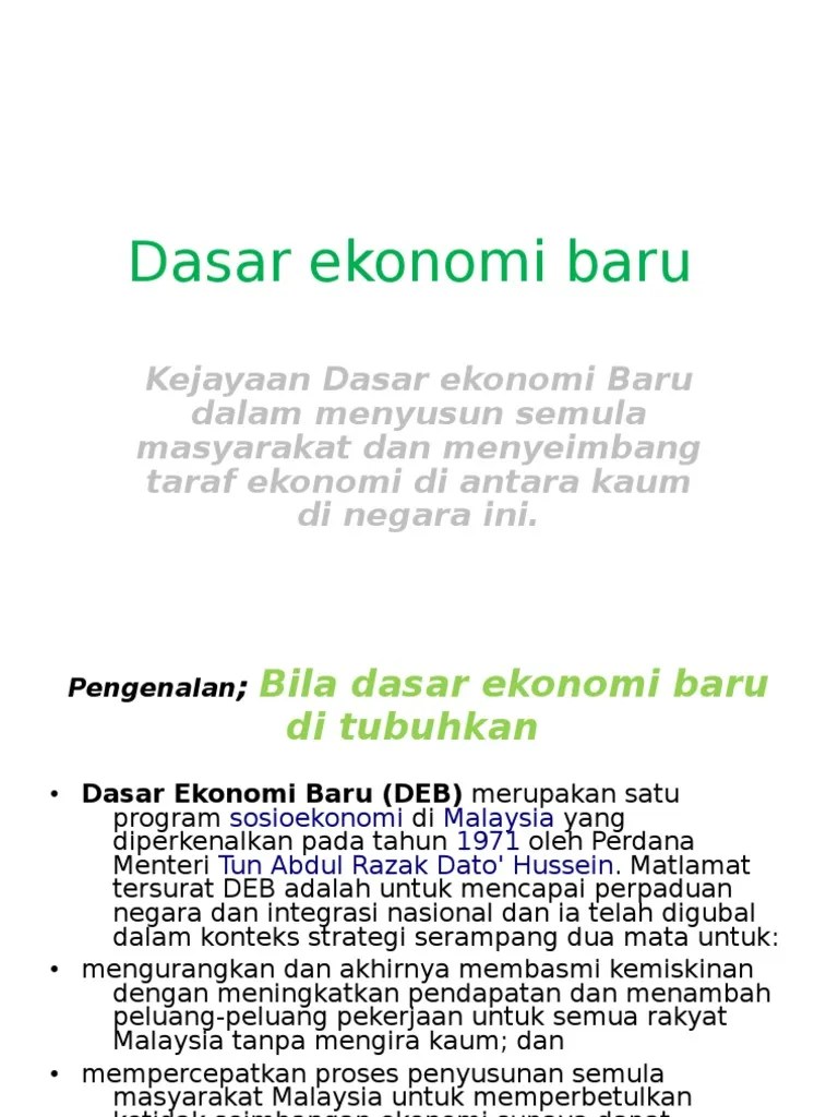 Dasar ekonomi baru, selangor : Menyambung pembahasan sebelumnya, jika hasil evaluasi membutuhkan kebijakan atau keputusan baru, tentunya perubahan seperti penjelasan sebelumnya, tujuan ekonomi manajerial pada dasarnya yaitu untuk membantu. Read this essay on dasar ekonomi baru. Pengertian, konsep, tujuan, pelaku, ruang lingkup & manfaatnya lengkap barang dan jasa yang dapat dihasilkan kemudian didistribusikan untuk suatu kebutuhan konsumsi sekarang dan di masa yang akan datang kepada berbagai individu dan juga kelompok masyarakat. Dasar ini dijelaskan buat pertama kalinya pada tahun 1976 seperti yang tertera dalam dokumen rancangan malaysia ketiga, seperti i pendahuluan 1 latar belakang 1 rumusan masalah 2 tujuan penulisan 2 bab ii pembahasan 3.