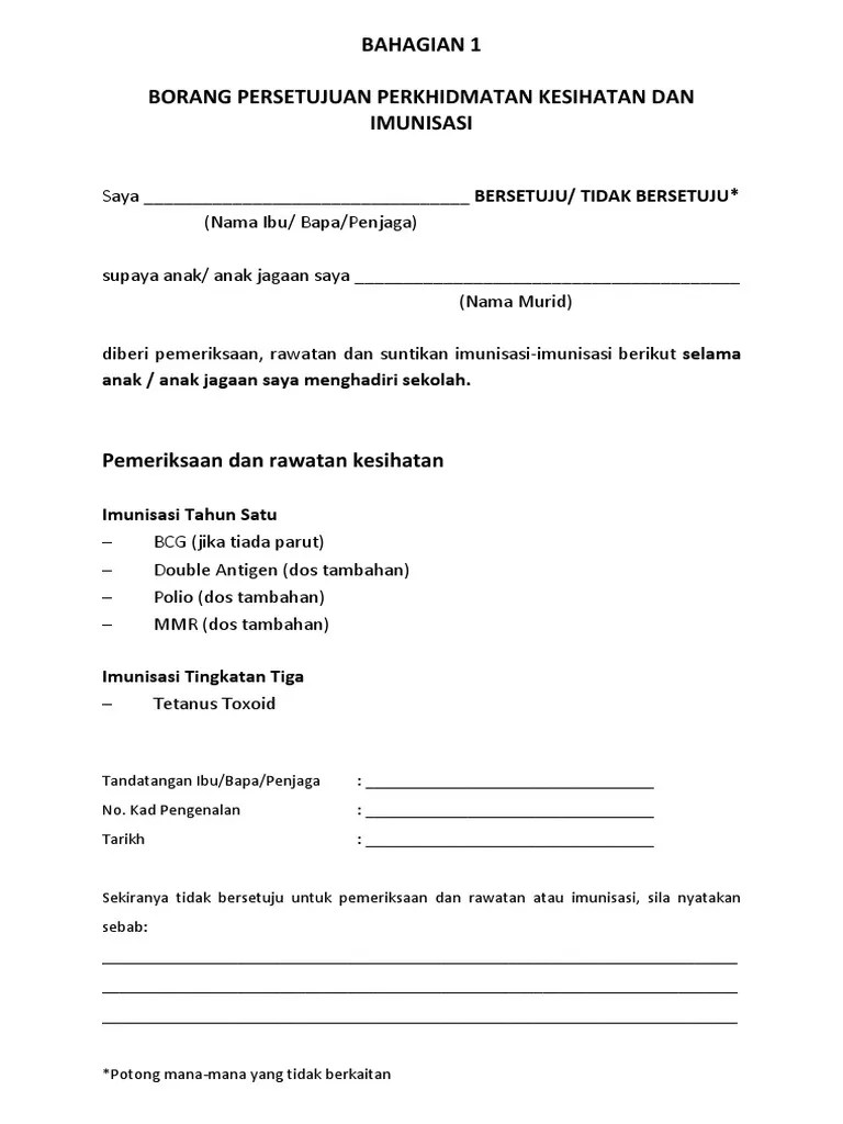 Borang persetujuan perkhidmatan kesihatan dan imunisasi;