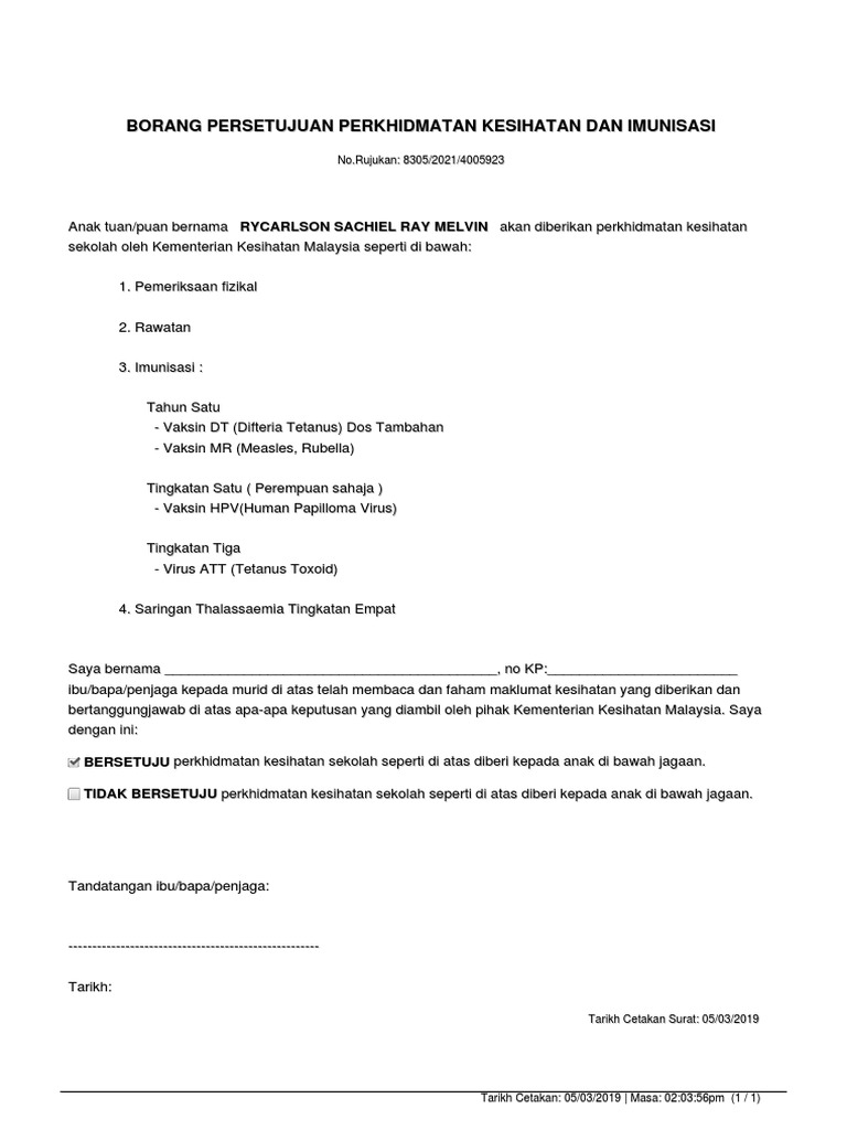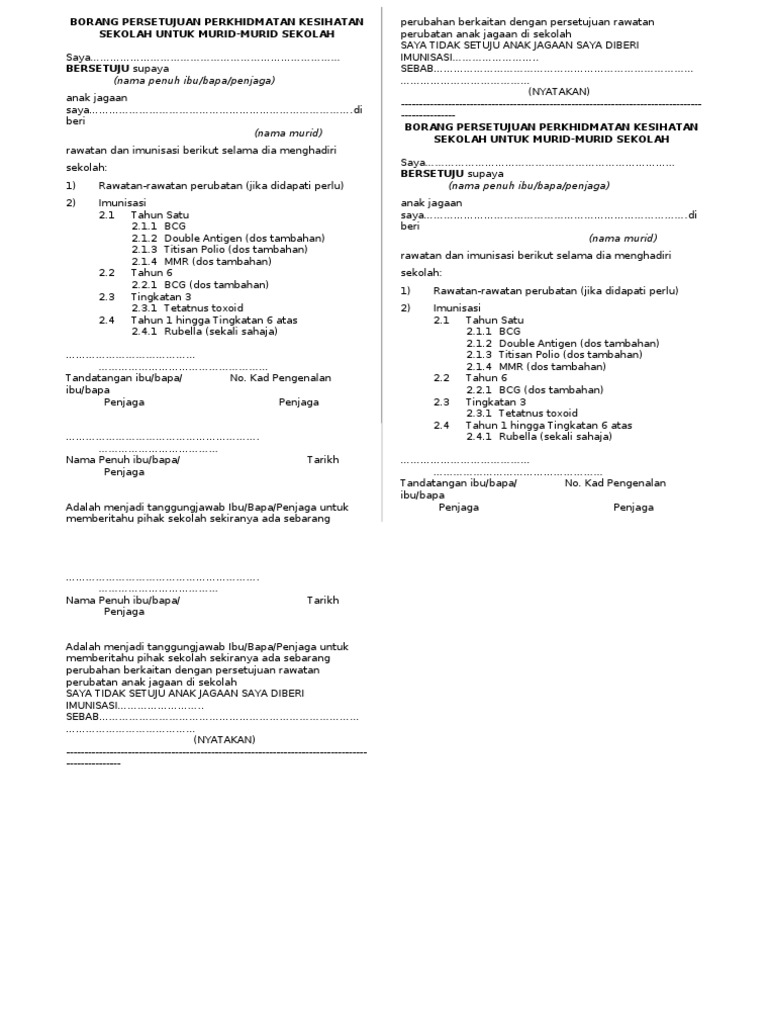 Borang Persetujuan Perkhidmatan Kesihatan Dan Imunisasi - Sekiranya tiada, surat akuan sumpah.. Sistem pendaftaran atas talian ini diwujudkan bagi memudahkan permohonan. Rekod imunisasi a) imunisasi semasa bayi (diisi oleh ibu/bapa/penjaga murid. Borang persetujuan perkhidmatan kesihatan dan imunisasi. Sila rujuk kad imunisasi anak anda) vaksin ya tidak tarikh/tahun diberi b.c.g hepatitis b dos 1 dos 2 dos 3. Borang maklumat murid lampiran a (kod keterangan) borang persetujuan perkhidmatan kesihatan dan.