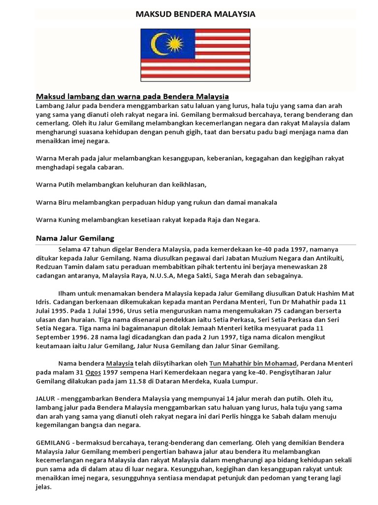 Bendera malaysia jalur gemilang maksud lambang dan warna. Anak bulan membawa maksud islam sebagai agama rasmi. Sebagai rakyat malaysia kita diharuskan tahu makna makna setiap icon yang berada di dalam bendera negara kita. Warna merah menyimbolkan keberanian, sementara warna putih menyimbolkan kesucian. Makna warna merah mengandung arti lambang dari keberanian, sedangkan warna putih merupakan tanda kesucian. Bendera malaysia mempunyai empat warna iaitu merah putih kuning dan biru. Adalah menjadi kewajiban bagi warganegara malaysia memahami maksud lambang dan warna bagi bendera malaysia. Bendera ini pernah mencetuskan kontroversi di malaysia apabila ia dipaparkan secara terbalik (bendera poland) pada kejohanan sukan sea yang berlangsung di kuala. Maksud warna bendera malaysia seret maklumat. Maksud warna pada bendera jalur genilang. 0 ratings0% found this document useful (0 votes). Namun sepertinya 14 garis tersebut pada. Savesave bendera malaysia for later.